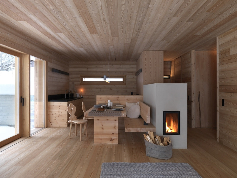 Také zařízení interiéru vychází z alpských tradic, i když se to třeba nezdá. Stěny i veškeré vybavení je výhradně dřevěné, dominují jasné, strohé linie a minimalistický design. Jedinou kudrlinkou jsou židle u jídelního stolu – tradiční tyrolské, ale nově vyrobené.