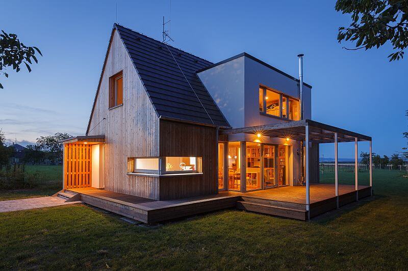 Tvarosloví domu je inspirováno tradičními chalupami. Základním archetypálním tvarem hmoty se strmější sedlovou střechou prostupuje hranol, kterým je na jihu rozšířena společenská část domu v přízemí a v podkroví vytvořen vikýř, a na opačné severní straně mělčí vikýř pro prostor schodiště a koupelny.