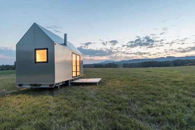 obr.: K přesunu domku Mobile Hut potřebujete jen větší osobní auto s tažným zařízením, tzv. koulí. Postavit ho můžete kdekoli bez stavebního povolení, jen se souhlasem majitele pozemku. Zdroj fotografie: Jan Gabriel, Artikul architekti