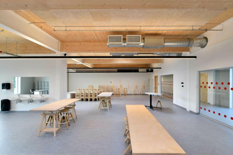Stávající malé učebny získaly více společných prostor, které je možno využívat víceúčelově. Hlavní devizou školy je umělecké zaměření, ať již jde o hudbu, nebo jinou tvorbu. Proto vzniklo několik nových ateliérů pro velké i malé skupiny, nebo také hudební posluchárny. Architekti, tedy museli vyřešit komplexní akustiku v celém projektu. Hledali materiál, který je možno aplikovat jak na stěny i strop a zároveň bude mít dostatečný útlum pohlcení ozvěny ( aw 0,9) a bude splňovat jak estetické, tak technické požadavky (odolnost, nehořlavost, údržba).