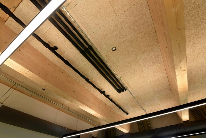 Volba padla na panely ACU-CEW z dřevní vlny a cementu v naturálním a mléčném odstínu. Jde prakticky o novodobí heraklit, který je však v pohledové kvalitě (tenkých vláken) s možností individuální úpravy hran i formátů. Výhodou je také ojedinělá struktura, která si na „nic nehraje". Díky certifikaci skladeb bylo možné správě konfigurovat jednotlivé sklady stěna a stropů s garancí výsledného efektu.