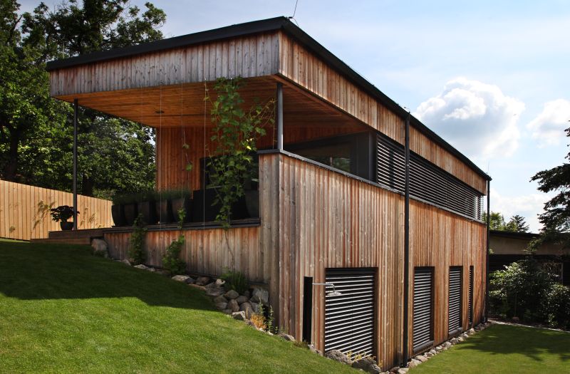 TIP: Jednoduchá moderní dřevostavba s pultovou střechou je dobře navržena do svažitého pozemku