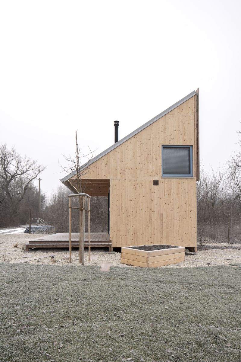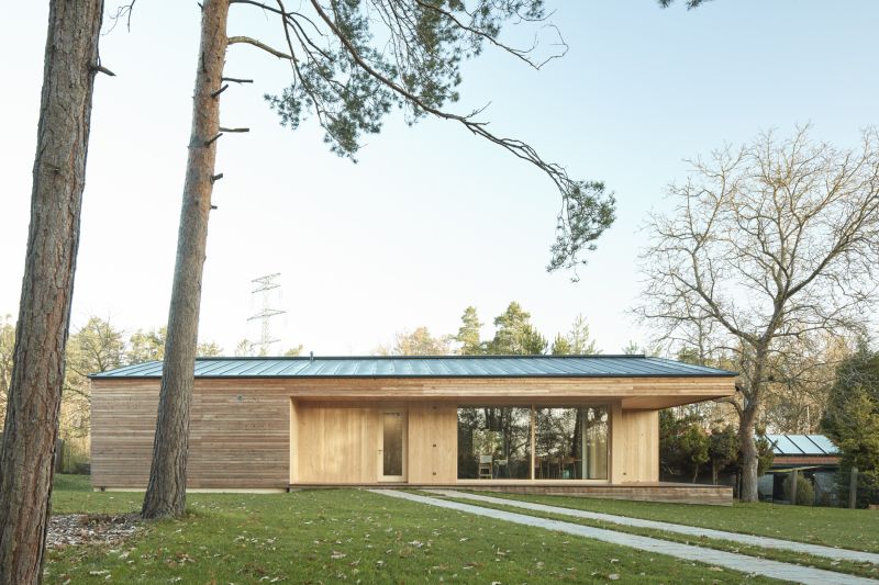 Rodinný dům se nachází v chatové kolonii. Tvar vychází z amerického bungalovu s ekonomicky řešeným sbíjeným krovem a nabízí těsný kontakt se zahradou.
