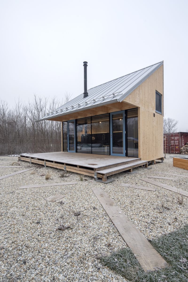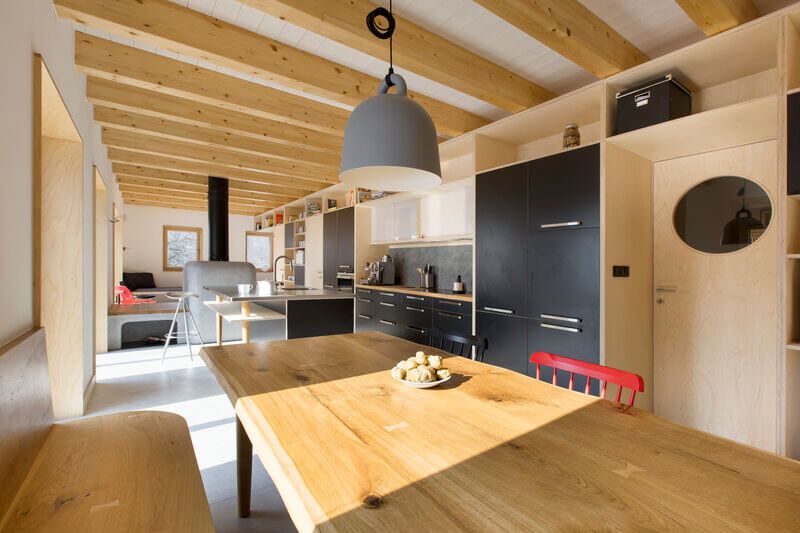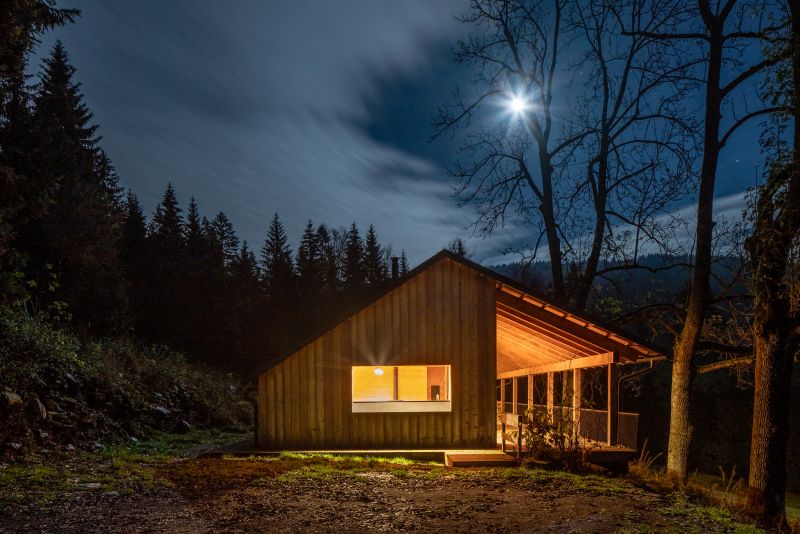 Založení objektu se vyřešilo zemními vrty. Právě tak dosáhli architekti minimální ekologické stopy. Nosná konstrukce chaty je pohledová z interiéru i exteriéru.