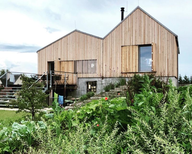 Novostavba rodinného domu leží na okraji vesnice s typickými dřevěnými stodolami s částečně zděnými fasádami. Architekti na tento tradiční vzhled venkova citlivě navázali a posunuli jej do 21. století.