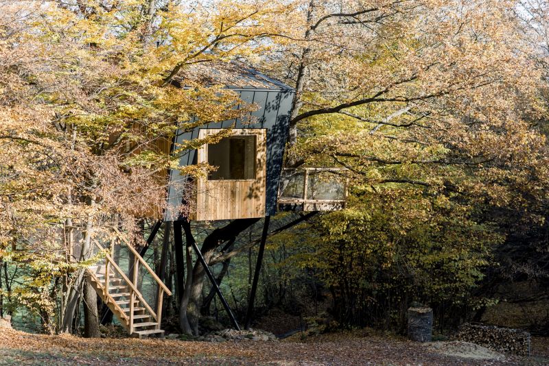 StromDom. Tak se jmenuje kouzelný objekt levitující čtyři metry nad zemí. Osazený je na ocelové podnoži, která svým tmavým vzhledem a nepravidelnou symetrii odkazuje na okolní bukové kmeny mladého lesa.
