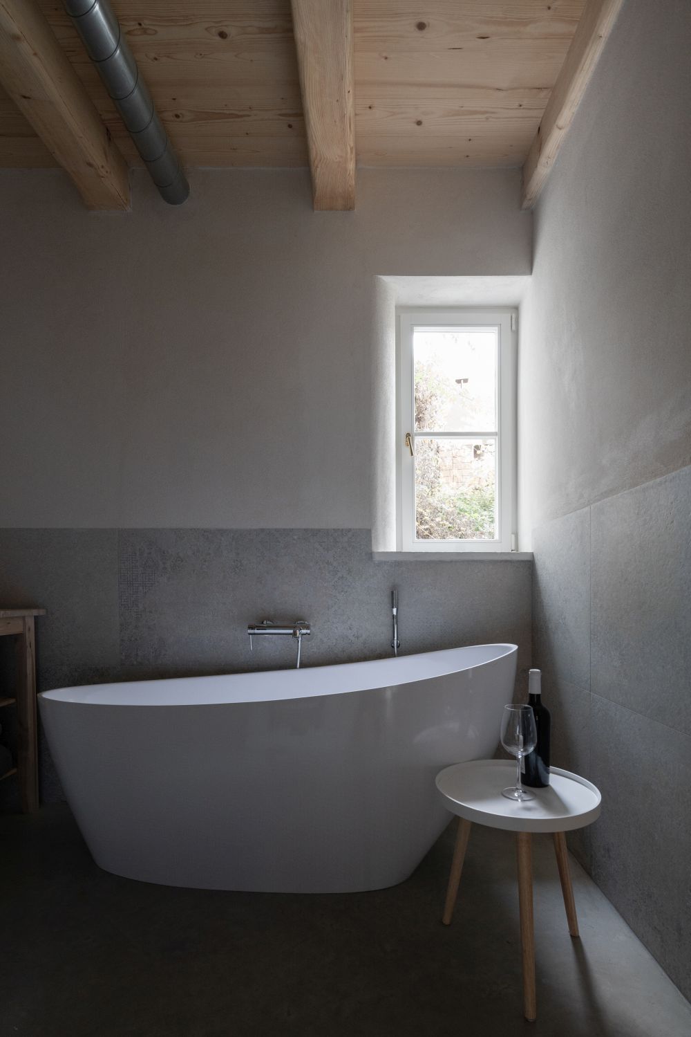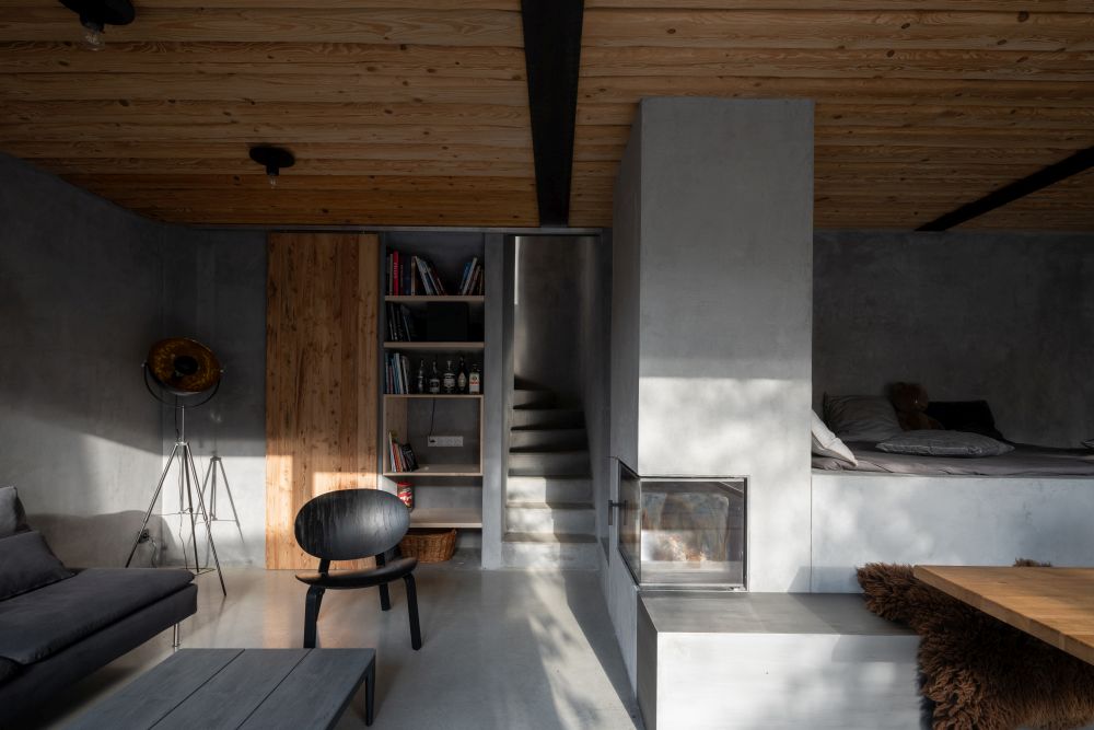 Směs rozmanitosti detailů a celkové dispoziční řešení vytváří architektonický zážitek z prostoru a ukazuje možnost implementace moderní architektury do historického kontextu vinařské uličky. Těleso obezděné krbové vložky je moderní interpretací tradičních kachlových kamen sloužících i pro příležitostné přespání. Část slouží částečně také jako úložný prostor pro jednoduchou kuchyňskou linku.