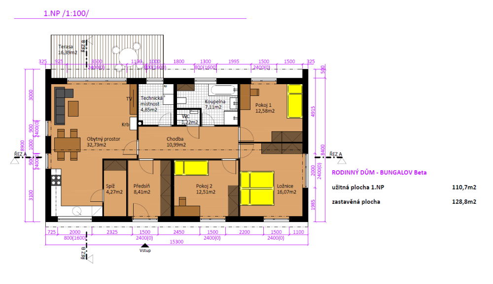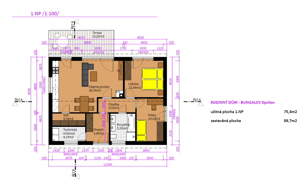 - Dispozice: předsíň, chodba, obývací pokoj spojený s kuchyňským koutem a jídelnou, spíž, ložnice, pokoj, koupelna a technická místnost