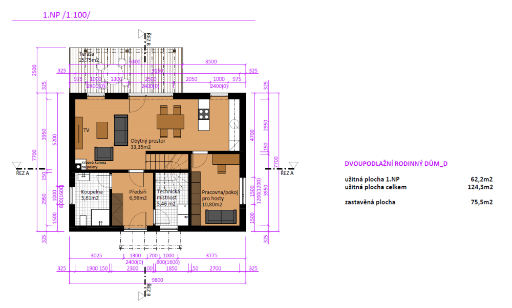 - Dispozice: předsíň, obývací pokoj spojený s kuchyňským koutem a jídelnou, pracovna/pokoj pro hosty, koupelna a technická místnostpodkroví: chodba, ložnice, dva dětské pokoje, koupelna a komora