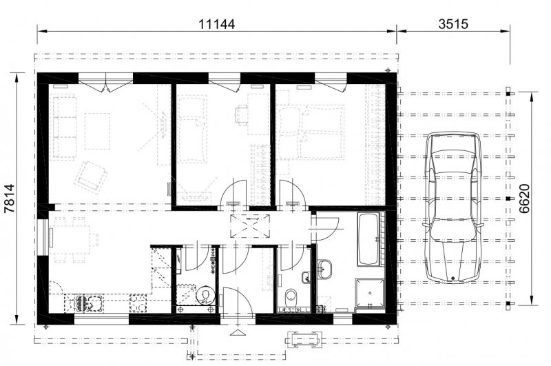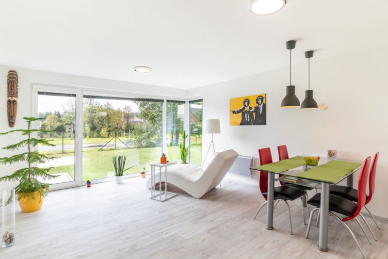 - Obývací pokoj spojený s kuchyňským koutem tvoří plochu 27,5 m2. Prostorná ložnice sousedí s koupelnou, která svými rozměry postačí celé rodině. Důležitou součástí domu je také zádveří, díky kterému nebudete do bytu nosit nečistoty z bot a návštěva si bude mít kde odložit kabáty.