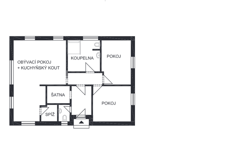 - Obývací část dřevostavby je opatřena třemi velkými prosklenými výlohami, které ji činní velice světlou a příjemnou. Vstup do půdního uložného prostoru je řešen stahovacími schody v zádveří.
