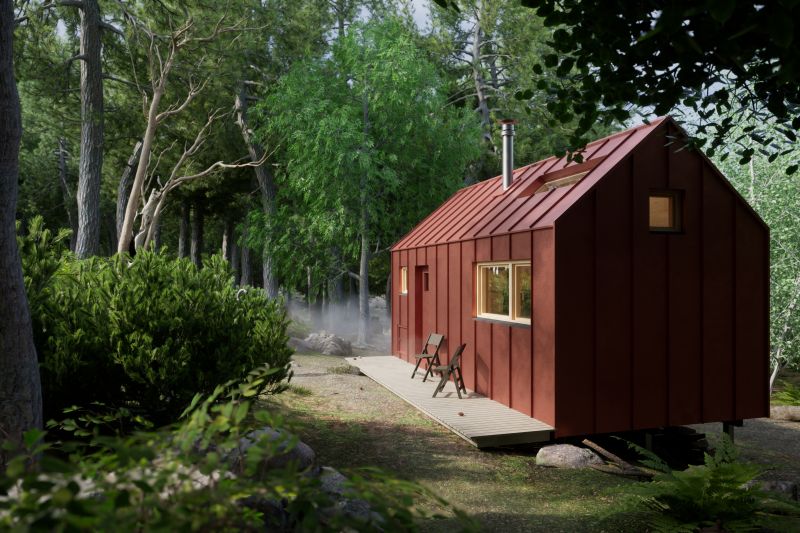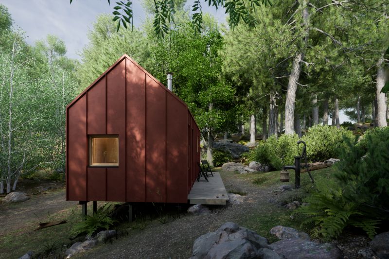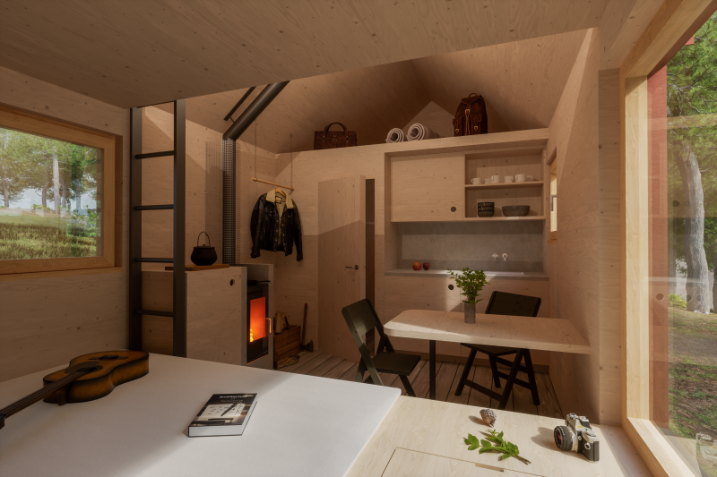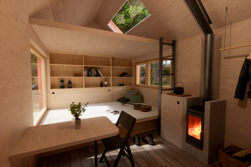 Dřevěná útulna zasazená do malebné přírody na okraji Šumavy je navržená primárně pro 2 hosty, pohodlně zde však přenocuje i 7 lidí. Není napojena na žádné sítě, vše si tak obyvatelé musí obstarávat postaru. Sloužit bude k pronájmu a jako útočiště pro zaměstnance firmy OK Pyrus.