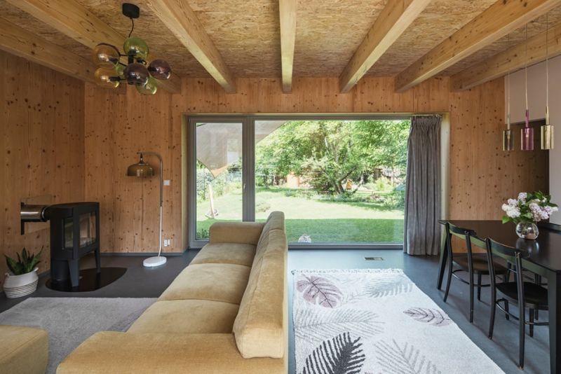 Příjemnou atmosféru celého domu doplňují krbová kamna, sloužící jako druhotný zdroj tepla. Stálý a úsporný komfort zajišťuje jednotka Atrea Duplex RA5/10/0, která slučuje funkci teplovzdušného vytápění s nuceným větráním s rekuperací. Teplo je dnes do akumulačního zásobníku o objemu 425 l dodáváno pomocí tepelného čerpadla, později je možné do této sestavy zapojit i fotovoltaické panely, pro které je provedena příprava.