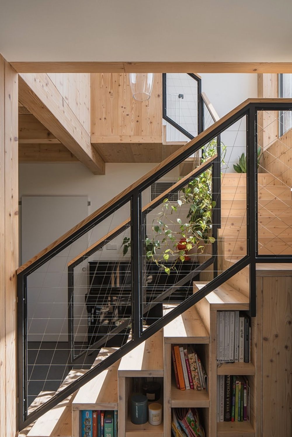 Vstup do domu je z boku. Zádveří má dostatek místa pro šatní skříň, navazuje na něj technická místnost s koupelnou. Obytný prostor je otevřen do obou stran – oknem nad kuchyňským pultem do ulice a prosklením do bujné zahrady. Místo zde má i pracovna s možností přespání a především prosluněné schodiště s funkcí knihovny a spíže.