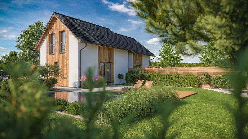 Útulná menší dřevostavba Vario Profi 73 vhodná pro manželský pár nebo víkendové bydlení. Svěžími prvky jsou přesah střechy na štítových stranách a jejich vertikální dřevěný obklad.