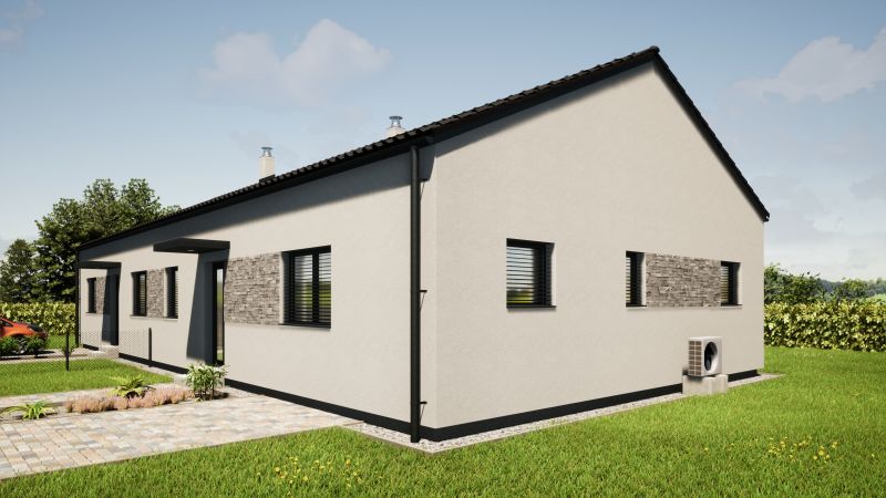 Dvojdům Duo 1-153 nabízí dvě samostatné bytové jednotky, každou s dispozicí 3+kk – přízemí je obytné, v patře jsou dvě ložnice. Dům je vhodný i do venkovského prostředí.