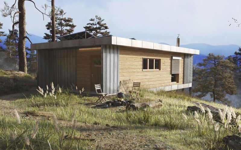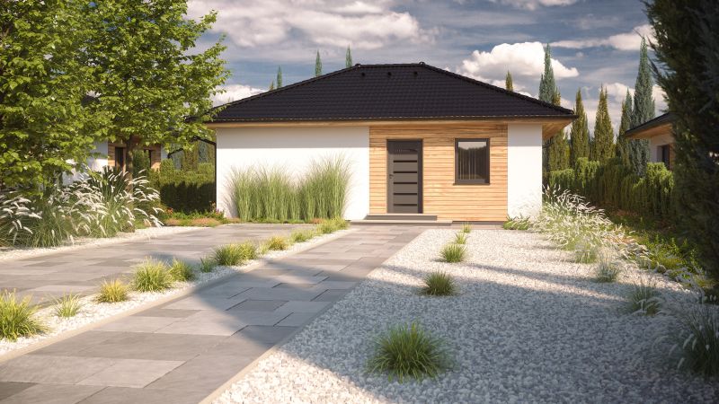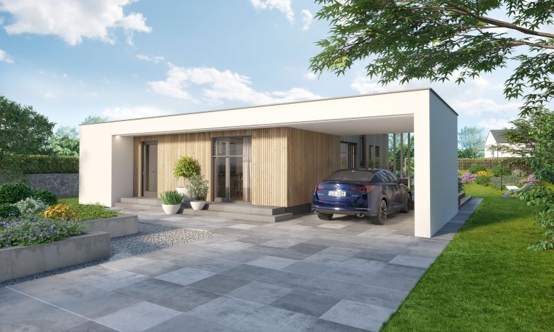 Jednoduchá přízemní dřevostavba RD 311 tvořená hlavní obytnou hmotou domu a částí se zastřešeným vstupem a parkovacím stáním.