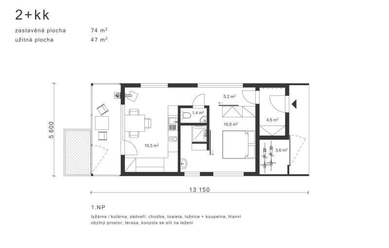 Malý bungalov MS 02B s dispozicí 2+kk určený pro seniory. Při jeho návrhu byly preferovány minimální investiční náklady při zachování kvality použitých materiálů.