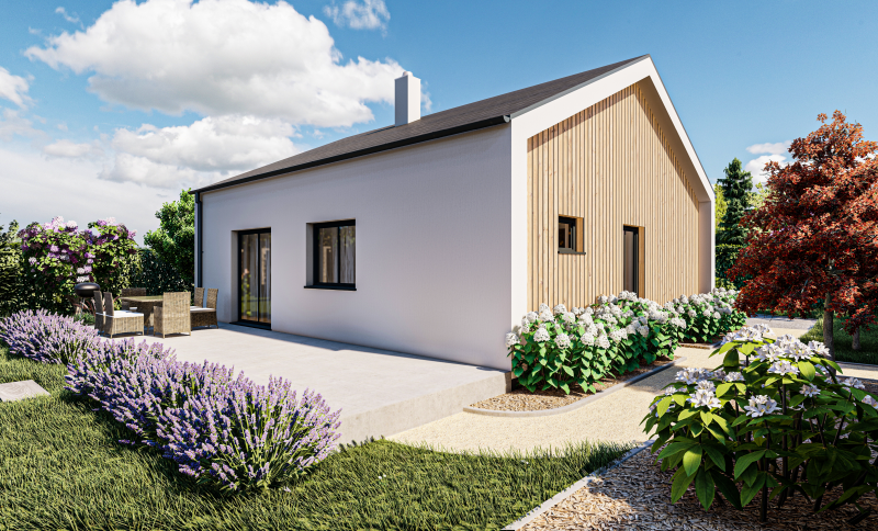 Jednopodlažní dřevostavba Rapido 1-60 pro mladé páry či seniory, která si vystačí i s menším pozemkem.