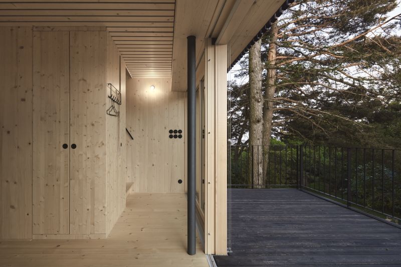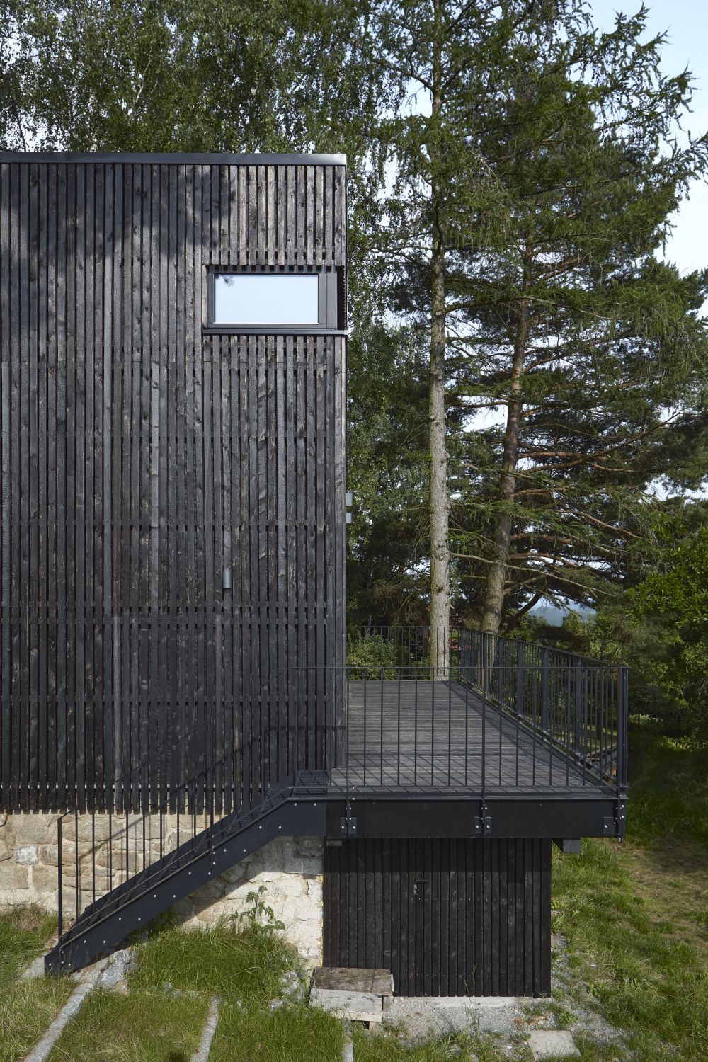 Návrh je charakteristický svými kontrasty a dialogy mezi zahradou a domem, interiérem a exteriérem, výraznou hmotou a dokonalým splynutím. Díky černé fasádě chata maximálně zapadá do okolní přírody, laťování z opáleného dřeva se proměňuje pod úhlem dopadajícího světla a jeho členitost evokuje kůru okolních stromů.