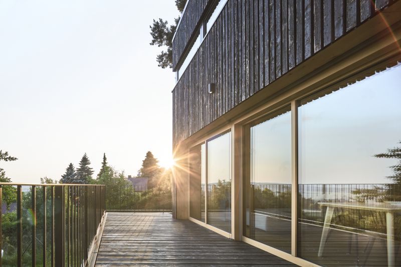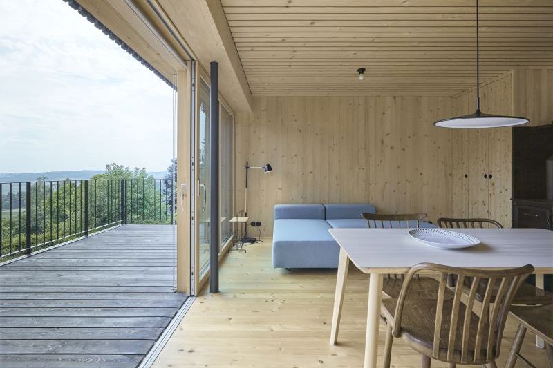 Na výraznou kuchyňskou linku navazují kamna, která slouží nejen k vaření, ale zaplňují v chladnějších dnech prostor uklidňujícím praskáním ohně. Dominantním prvkem přízemí jsou velká prosklená okna, po jejichž odsunutí dochází k propojení interiéru s terasou. Ta se v létě stává součástí obytného prostoru.