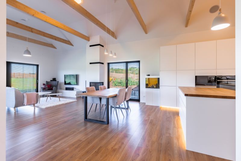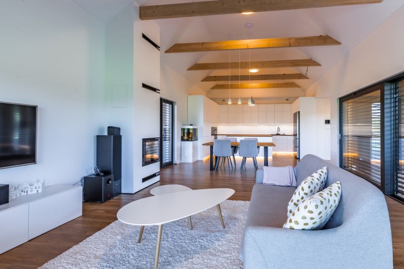 Jedna část domu je věnována pouze hlavnímu obytnému prostoru s bílým kuchyňským koutem a jídelnou, který je díky otevření do krovu velice vzdušný a světlý. Spojovací chodba vede do přízemního podlaží druhého objektu.