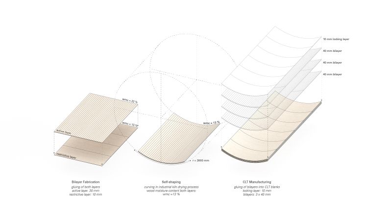 Deformační chování dřeva při změnách vlhkosti je vědě i praxi známo. Výrobci lodí a nábytku ohýbají dřevo již mnoho staletí, aby splnili hydrodynamické a ergonomické požadavky. Pro konstrukce budov jsou však tyto techniky poměrně neobvyklé.