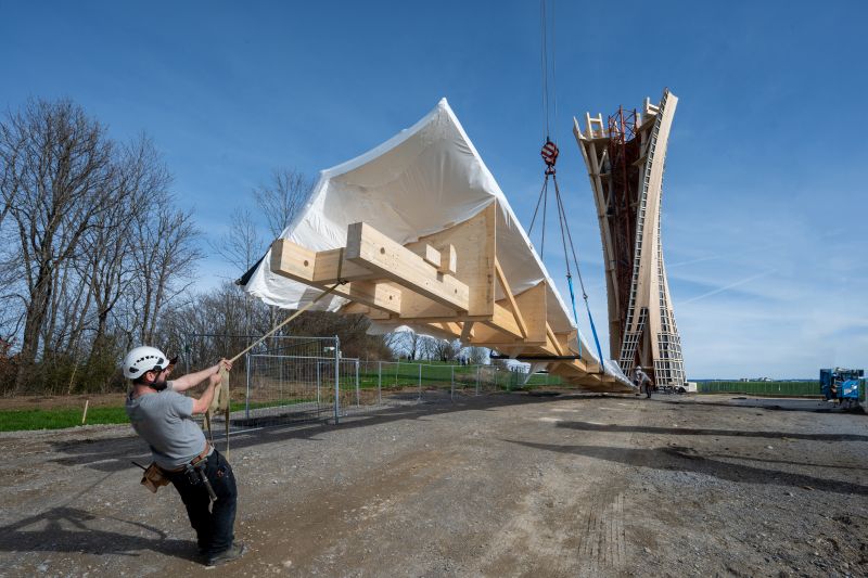 Kosmická loď, vývrtka, nebo rozhledna? Konstrukce každopádně na první pohled průkopnická. Zblízka jasná a o to překvapivější – vyrobená z CLT. Osobitý výraz této věže je provokativním důkazem skrytých možností designu v přirozeně obnovitelné, regionálně vyráběné a nákladově efektivní dřevěné architektuře. Dopracovat se k ní lze díky vědeckému výzkumu, materiálově výpočetnímu návrhu a digitální výrobě.