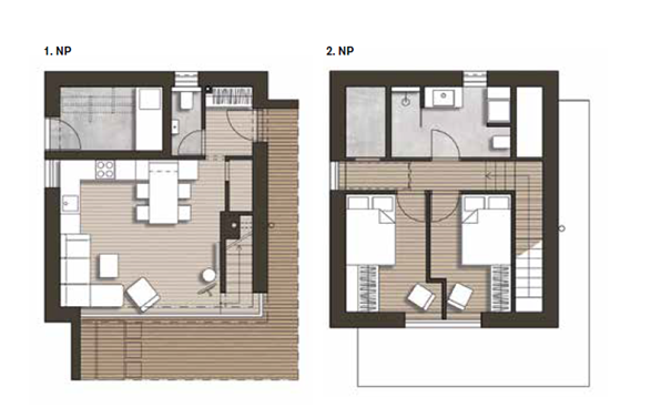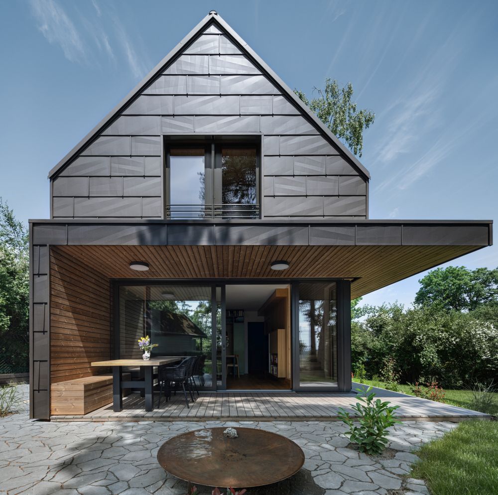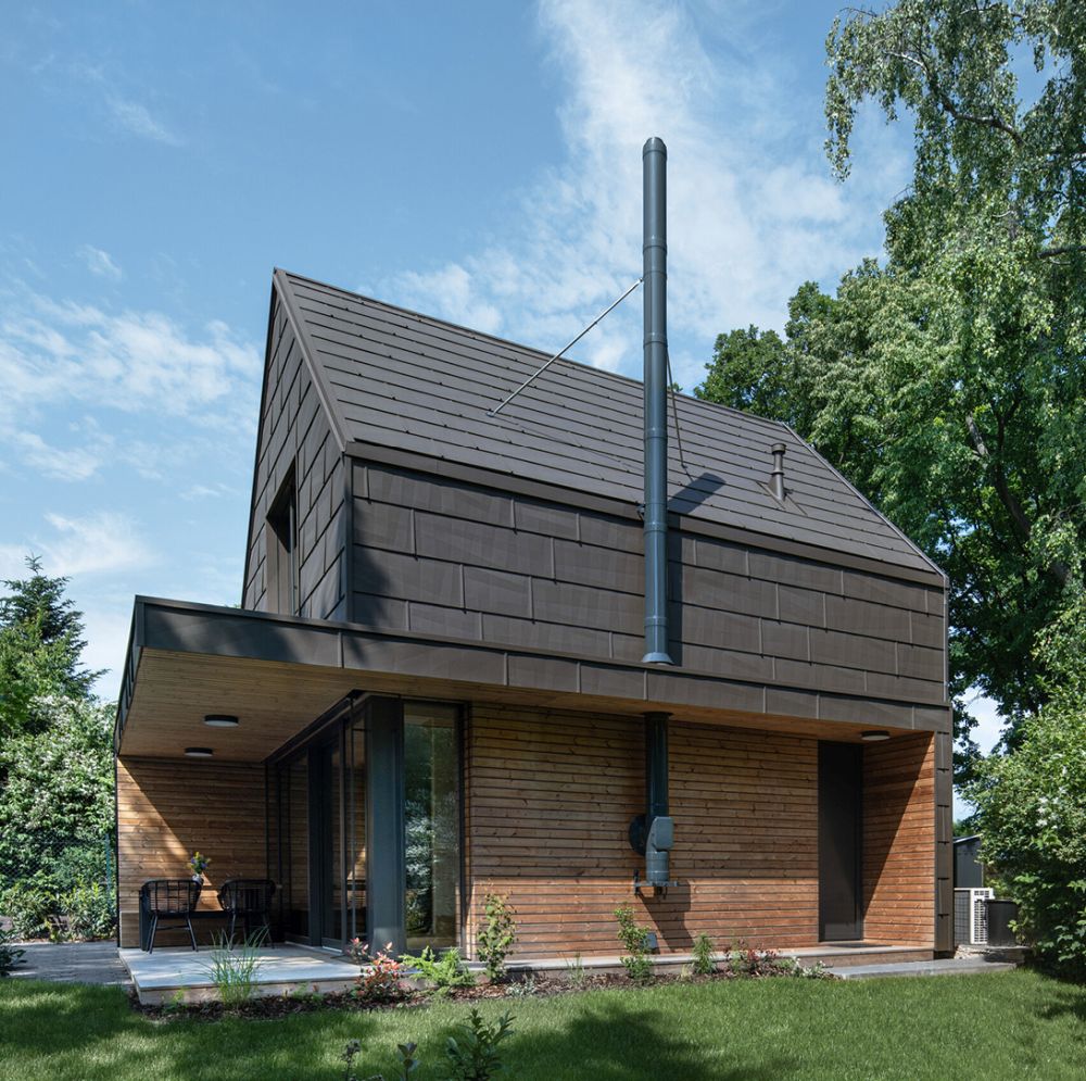 Klidné útočiště v přírodě, obklopené vzrostlými jehličnany, nedaleko velkoměsta, přesto schované před světem. Pozemek je malý, regulativy přísné. Zbytečných metrů čtverečních ale netřeba. Stačí trochu architektonického umu, šikovná projekční a realizační firma a „šiška" obložená hnědými hliníkovými šablonami je na světě. Co nemá do prostoru, to vynahrazuje atmosférou a kvalitou použitých materiálů. A protože dřevo ke dřevu patří, rozhodnutí vybudovat chatu z masivních panelů z českých smrků je příhodné a logické.