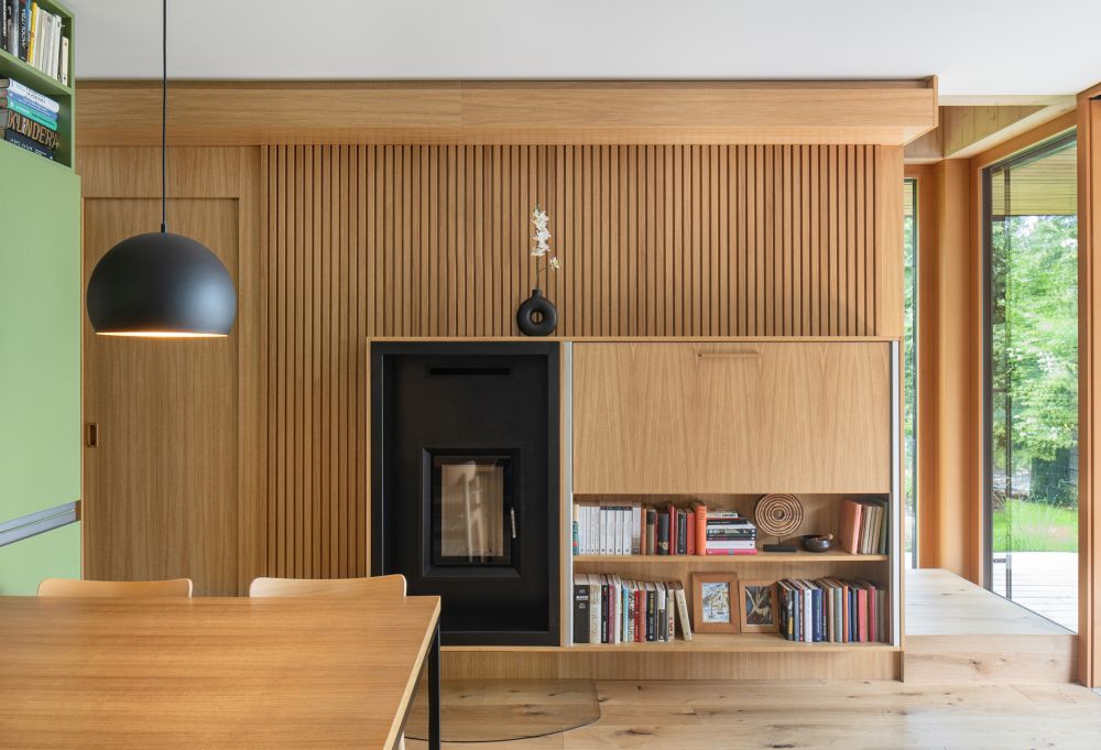 Jídelní stůl se nenásilně vsunul mezi kuchyňské skříňky, knihovna vrůstající do stropu přechází z „obýváku" nad kuchyňskou linku. Část skříněk je vyvedena ve sjednocujícím motivu dubového dřeva se stejnou profilací, jakou má stěna u krbu. Dřevo doplňuje nevtíravá pastelová zelená barva. Za obývací stěnou s krbem je schované schodiště do patra.