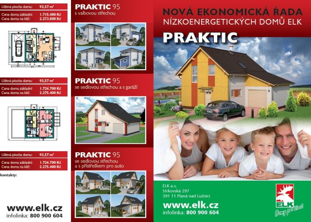 Domy PRAKTIC jsou sice cenově dostupnější, přesto splňují parametry nízkoenergetických domů. Koeficient prostupu tepla (U) obvodové stěny domu PRAKTIC, kterou tvoří nosná rámová konstrukce o tloušťce 160 mm s celkem 260 mm silnou tepelnou izolací (z toho je 100 mm fasádního polystyrenu), je pouhých 0, 20 W/m2K. I v dalších ohledech je zřejmé, že řada PRAKTIC důsledně kopíruje nejlepší vlastnosti a základní filozofii firmy ELK – nabízet perfektní kvalitu za přijatelnou cenu, zákaznický servis a stálý inovační proces.