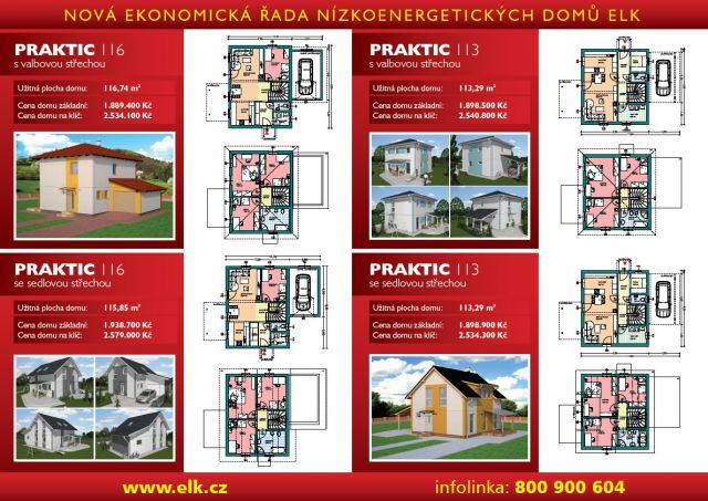 Nejmenší z nových domů – PRAKTIC 95 nabízí v provedení 3+kk za 2 273 800 Kč na klíč pohodlné bydlení 3-4členné rodině. Dům je dostupný v provedení s valbovou nebo sedlovou střechou, na přání je možné dům doplnit o kryté garážové stání nebo o garáž. V přízemí je k dispozici velký obývací pokoj s kuchyňským koutem a technické zázemí, v patře jsou umístěny dvě ložnice a koupelna. Dům PRAKTIC 113 (4+kk) má podobné řešení, v patře však nabízí až tři místnosti. Největší z novinek – PRAKTIC 116 v provedení 5+1 za 2 579 000 Kč - má v přízemí navíc i pracovnu.
