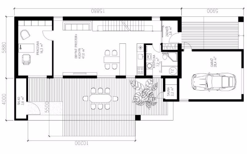 Objekt má dvě podlaží, kompaktní tvar a půdorys ve tvaru protáhlého obdélníka. Je založen na vrstvě pěnového skla, takže úroveň podlahy je téměř ve stejné výšce jako úroveň terénu. Na skle už je rovnou železobetonová deska, která je současně podlahou v přízemí domu. Tím jsme ušetřili za skladbu podlahy, přestože jsme přišli o možnost vést tudy jakékoli rozvody. V tomto případě jsme to nepotřebovali a vystačili si s příčkami.