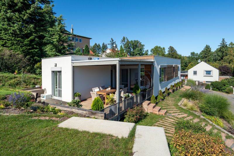Protože výstavba domu proběhla rychle a bez komplikací, zbylo čtyřčlenné rodině spoustu energie na svépomocné zbudování krásné kaskádovité zahrady, včetně sklípku na skladování ovoce, zeleniny i dobrého vína. Jednoznačnou dominantou prostorné svažité parcely jsou krásné výhledy na okolní panoramata. Realizační firma Eko modular pomohla také s dodávkou zahradního domku.