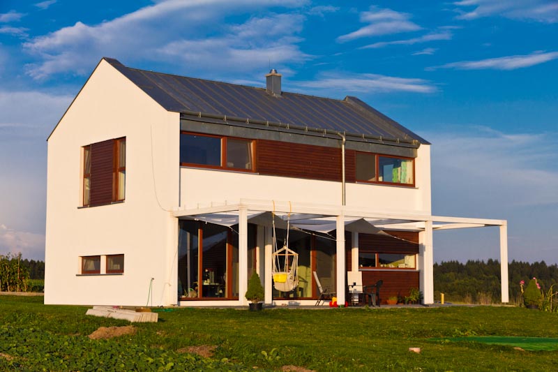 Dům, který zde představujeme, spadá do kategorie energeticky úsporných domů a splňuje tepelně izolační vlastnosti podle všech platných předpisů a norem. Strop rodinného domu je tvořen z KVH hranolů, které jsou ideálním materiálem díky tvarové stálosti. Na domě je použita střešní krytina z falcovaného titanzinkového plechu, povrch venkovních stěn je tvořen kombinací silikonové fasády a dřevěného obkladu ze smrkových palubek s povrchovou úpravou lazurovacím nátěrem. Vytápění domu je řešeno elektrokotlem, kombinací podlahového topení v přízemních částech domu a radiátory v podkroví.